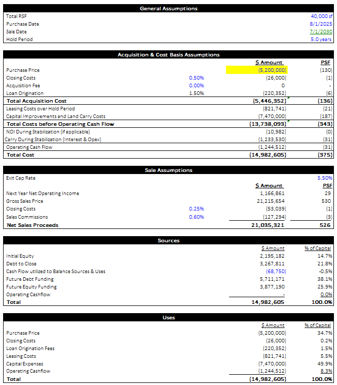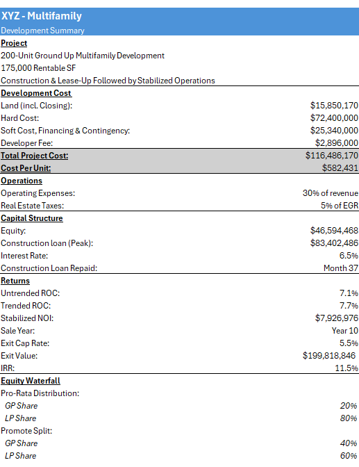 Through these models, I focused on developing a strong foundation in rent rolls, expense forecasting, development and operating assumptions, return metrics, and scenario testing. My focus is not only to produce well-structured models, but to understand the drivers of value, risk, and performance within each deal.
